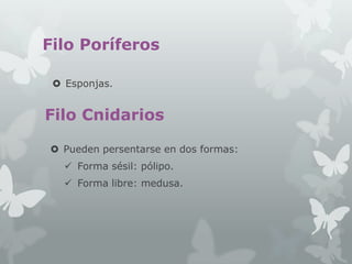 Este documento presenta una clasificación detallada de los reinos animales. Describe los principales filos como poríferos, cnidarios, moluscos, equinodermos, artrópodos y cordados. Dentro del filo de los cordados, se enumeran las clases de anfibios, reptiles, aves y mamíferos, con sus respectivos órdenes y familias.