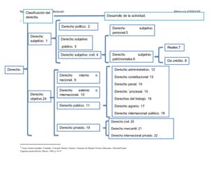 El documento clasifica y define los diferentes tipos de derecho, incluyendo el derecho subjetivo, derecho objetivo, derecho político, derecho público y privado, derecho interno e internacional, derecho civil, penal y administrativo, derecho del trabajo y agrario, derecho procesal y mercantil, entre otros. Explica las diferencias entre los derechos subjetivos públicos, civiles y patrimoniales, así como los derechos reales y de crédito. También define el derecho constitucional, internacional público y privado.