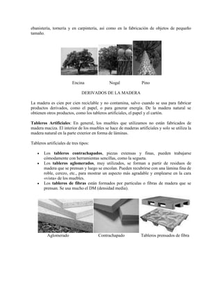 El documento clasifica las maderas en duras y blandas. Las maderas duras proceden de árboles de hoja caduca y tienen un crecimiento lento, por lo que son más densas y resistentes. Algunos ejemplos son el roble, el nogal y el cerezo. Las maderas blandas proceden de coníferas y tienen un crecimiento más rápido, por lo que son más ligeras y baratas, aunque menos duraderas. De la madera también se obtienen derivados como tableros artificiales, papel y cartón.