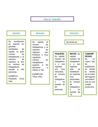 Este documento clasifica las empresas según varios criterios como su sector económico (industrial, comercial, agropecuaria, etc.), su tamaño (micro, pequeña, mediana, grande), el origen de su capital (privado, mixto, público) y su conformación y explotación (grupos económicos, multinacionales, locales, nacionales). Da ejemplos de empresas que se encuadran en cada categoría.