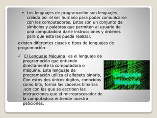 Existen diferentes tipos de lenguajes de programación, incluyendo lenguajes de máquina, de bajo nivel y de alto nivel. Los lenguajes de máquina son entendidos directamente por las computadoras pero son difíciles de usar, mientras que los lenguajes de alto nivel son más fáciles de usar e independientes de la máquina pero requieren de compiladores o intérpretes. Los lenguajes también se clasifican como imperativos, declarativos, orientados a objetos, orientados al problema y naturales.