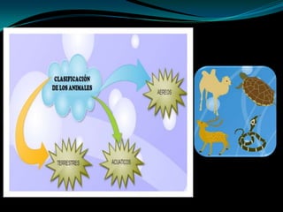 El documento clasifica diferentes tipos de animales como acuáticos, terrestres, domésticos y salvajes. Lista animales domésticos como el perro, el gato y la tortuga, y animales salvajes como el tigre, la jirafa y la serpiente. También menciona la cadena alimenticia.