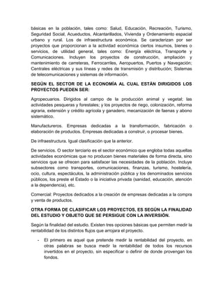 El documento describe los diferentes tipos de proyectos según su carácter, categoría, sector económico y finalidad. Los proyectos pueden ser económicos o sociales, de producción de bienes, prestación de servicios o infraestructura, dirigidos a sectores como la agricultura, manufactura o servicios, y estudiados para medir la rentabilidad total, del inversionista o la capacidad de pago. Los proyectos son importantes para el desarrollo económico y social al identificar necesidades y mejorar la calidad de vida.