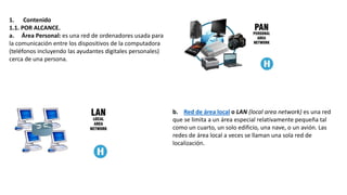 Este documento clasifica y describe diferentes tipos de redes según varios criterios como alcance geográfico (LAN, MAN, WAN), tipo de conexión (cableado, inalámbrico), topología física (bus, estrella, malla), direccionalidad de datos (simplex, duplex, half-duplex), grado de autentificación (privada, pública), grado de difusión (intranet, internet) y servicio o función (comercial, educativa). En total, se definen e ilustran nueve categorías diferentes para clasificar redes de comput