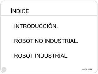Este documento clasifica los robots en dos grandes grupos: robots no industriales (de servicio) y robots industriales. Los robots no industriales incluyen robots exploradores espaciales, humanoides, andantes, voladores y asistentes. Los robots industriales se clasifican según la Asociación Francesa de Robótica Industrial, la Federación Internacional de Robótica, generación y función.