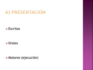 Este documento lista diferentes tipos de pruebas psicométricas, incluyendo pruebas escritas, orales, motrices, proyectivas gráficas, de inteligencia y neuropsicología; también menciona pruebas de aptitudes ocupacionales, velocidad, potencia, objetivas y subjetivas; cerradas y abiertas; de opción múltiple; grupales e individuales; para niños, adolescentes, adultos y tercera edad; y pruebas verbales, de papel, de ejecución y con tecnología.