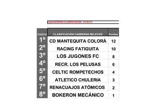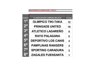 El documento presenta las clasificaciones de dos ligas internas. En la 2oCiclo, el primer puesto lo ocupa el CD Mantequita Colorá con 12 puntos, y el último el Bokerón Mecánico con 1 punto. En la 3oCiclo, el primer puesto es para el Olimpico Tiki-Taka también con 12 puntos, y el último para los Zagales Fuensanta con 1 punto.