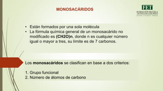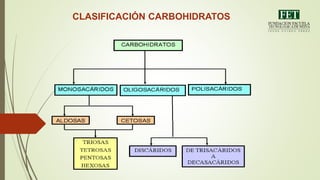 Este documento clasifica los carbohidratos en monosacáridos, disacáridos y polisacáridos. Los monosacáridos se clasifican por su grupo funcional y número de átomos de carbono, e incluyen pentosas y hexosas. Los disacáridos más comunes son la sacarosa, lactosa y maltosa. Los polisacáridos incluyen almidón, glucógeno, celulosa y quitina. Los carbohidratos se descomponen a través de la glucólisis y el ciclo de Krebs