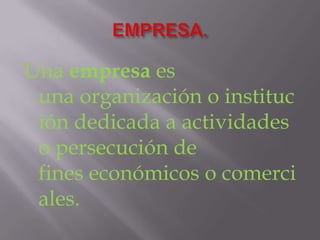 Este documento clasifica las empresas de diferentes maneras: 1) por su actividad como industriales, comerciales o de servicio; 2) por la procedencia de su capital como privadas, públicas o mixtas; 3) por su forma jurídica como individuales o societarias; y 4) por su tamaño como micro, pequeñas, medianas o grandes. También las clasifica según su ámbito, desde locales hasta mundiales, y por su cuota de mercado como aspirantes, especialistas, líderes o seguidoras.