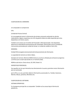 Este documento clasifica el hardware y software de un computador. En cuanto al hardware, describe las principales partes como la CPU (unidad central de procesamiento), la memoria y los dispositivos periféricos. En cuanto al software, distingue entre sistemas operativos, programas de aplicación y lenguajes de programación. Los sistemas operativos gestionan los recursos del hardware y brindan una interfaz entre el usuario y la máquina, mientras que los programas de aplicación ejecutan tareas específicas y los lenguajes de programación se usan para des