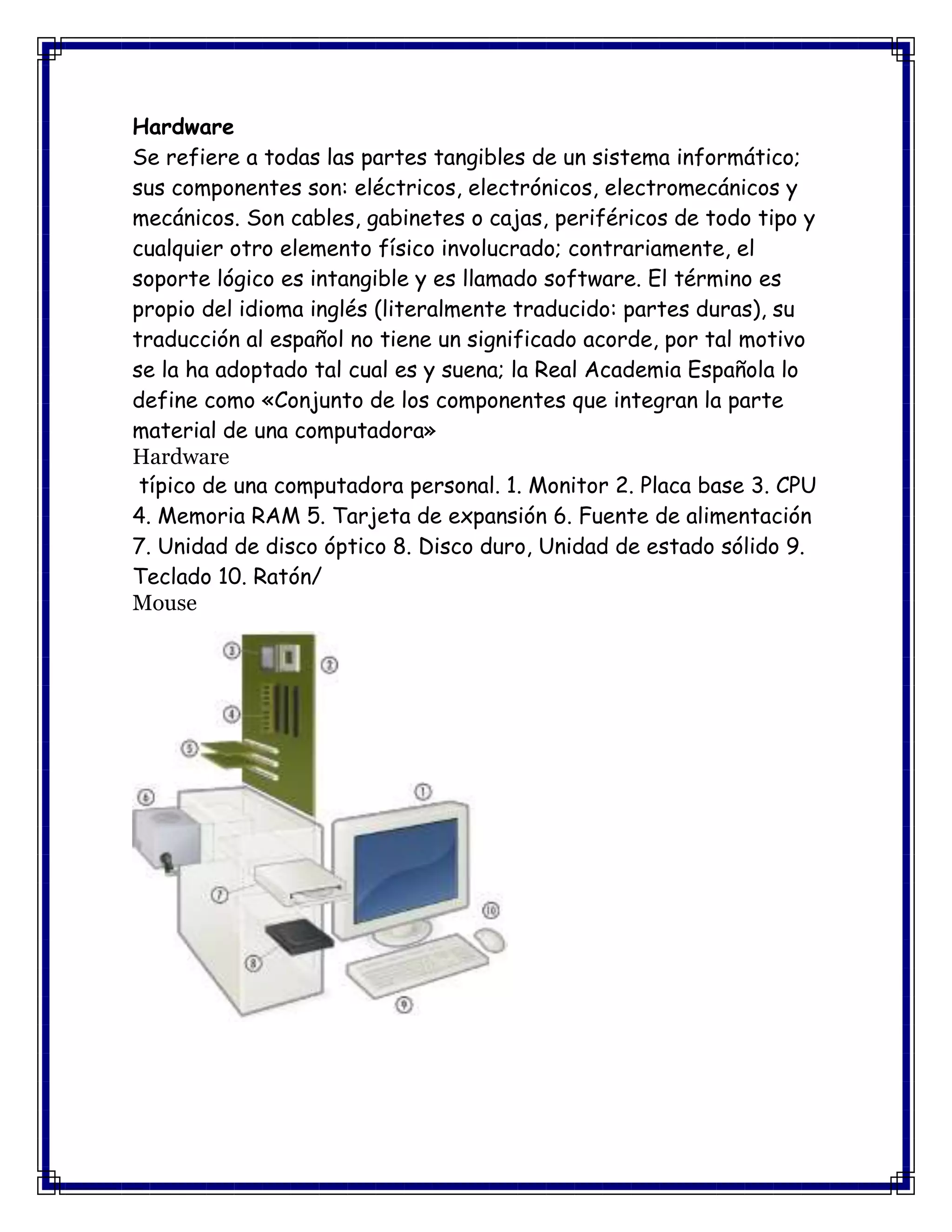 El documento habla sobre hardware y software. El hardware se refiere a las partes físicas de un sistema como monitores, placas base, CPU, memoria RAM y periféricos. El software incluye sistemas operativos que gestionan las actividades de la computadora, lenguajes de programación que permiten dar instrucciones a la computadora, y aplicaciones de software diseñadas para tareas específicas.