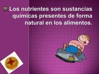 Los principales nutrientes son los carbohidratos, lípidos, proteínas, vitaminas, minerales y agua. Los carbohidratos y lípidos son compuestos orgánicos abundantes que forman parte de una alimentación equilibrada, mientras que las proteínas regulan los procesos celulares. Las vitaminas y minerales también son esenciales para el funcionamiento enzimático y de los organismos. El agua es indispensable como disolvente de compuestos.