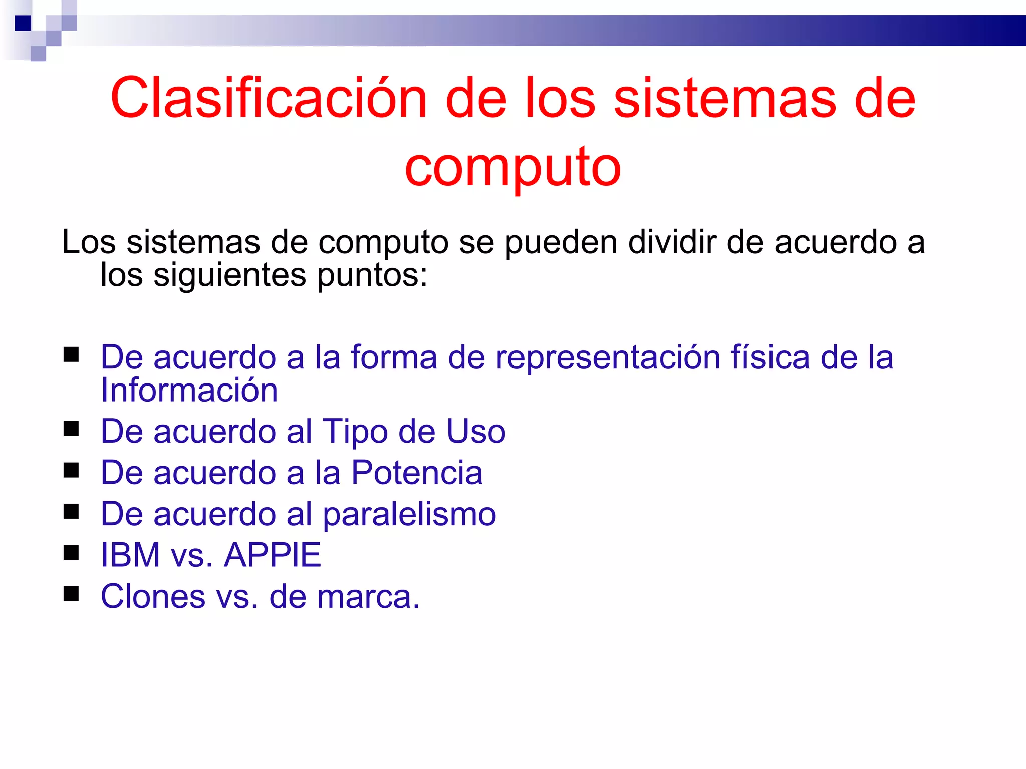 Este documento clasifica los sistemas de computo de acuerdo a la forma de representación física de la información (analógicos, digitales, híbridos), el tipo de uso (de uso general, de uso específico), la potencia (supercomputadoras, macrocomputadoras, servidores de red, estaciones de trabajo, computadoras personales, móviles), el paralelismo (a nivel de instrucciones, a nivel de procesadores), y marca (clones vs de marca).