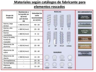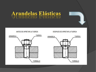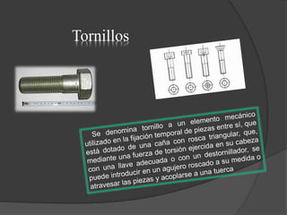 El documento describe los diferentes tipos de tornillos y sus designaciones. Explica que la designación de un tornillo incluye el tipo de cabeza, la rosca, la longitud y la norma. Luego detalla los diferentes tipos de roscas según normas como DIN, ISO y BS, así como métodos de seguridad como contratuercas, arandelas elásticas y pasadores.