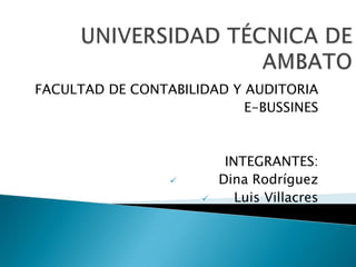 Este documento habla sobre el comercio electrónico y lo define como la compra y venta de productos o servicios a través de medios electrónicos como Internet. Explica que existen diferentes tipos de comercio electrónico como B2B (negocio a negocio), B2C (negocio a consumidor), C2C (consumidor a consumidor), P2P (de persona a persona) y B2G (negocio a gobierno) y C2G (ciudadano a gobierno). También discute las ventajas e inconvenientes del comercio electrón