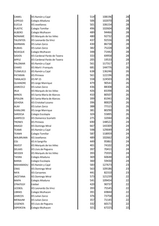 El documento presenta los resultados de diferentes equipos en una competición educativa. Se muestra el nombre del equipo, el centro educativo al que pertenece, su puntuación en la competición (MPI), el beneficio económico obtenido y los puntos totales. Los primeros equipos obtuvieron más de 600 puntos y beneficios por encima de los 120.000 euros, mientras que los últimos equipos anotaron menos de 100 puntos y beneficios inferiores a los 5.000 euros.