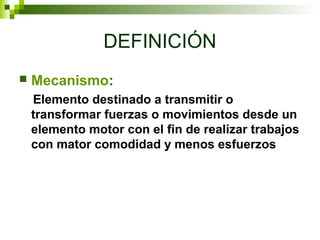 El documento define los mecanismos como elementos destinados a transmitir o transformar fuerzas o movimientos desde un elemento motor para realizar trabajos con mayor comodidad y menos esfuerzos. Explica que los mecanismos se clasifican en transmisión lineal-lineal, circular-circular y circular-lineal, e ilustra ejemplos como la palanca, polea, engranajes y tornillos para cada tipo de transmisión.