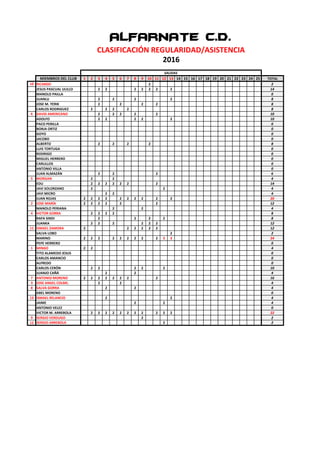 Este documento presenta la lista de miembros de un club deportivo y su asistencia a las sesiones de entrenamiento durante el año 2016. En total hay 25 miembros en el club. La mayoría asistió a entre 2 y 14 sesiones durante el año. Solo 3 miembros, Victor M. Arrebola, Juan Rojas y Marino asistieron a 20 sesiones o más, lo que muestra una alta regularidad en su asistencia a los entrenamientos del club.