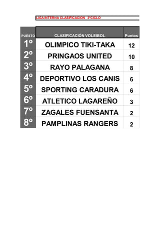 El documento presenta las clasificaciones de dos ciclos de una liga interna de voleibol. En el 2o ciclo, Celtic Rompetechos lidera la tabla con 12 puntos, seguido por CD Mantequita Colorá con 10 puntos. En el 3o ciclo, Olimpico Tiki-Taka está en primer lugar con 12 puntos, mientras que Pringaos United lo sigue con 10 puntos.