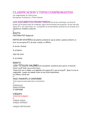 Los comprobantes se clasifican en documentos probatorios y títulos valores. Los documentos probatorios incluyen boletas, facturas, notas de ajuste, vales de caja y remitos, que constituyen la base de prueba de las operaciones de la empresa. Los títulos valores son documentos necesarios para ejercer derechos literales y autónomos, como vales, pagarés, cheques y letras de cambio.