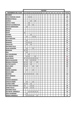 El documento presenta la asistencia de los miembros de un club a las sesiones de entrenamiento durante 34 semanas. Se muestra el número de sesiones a las que asistió cada miembro. Los miembros con mayor asistencia fueron Juan Rojas con 36 sesiones, José M. Alcaucín y Marino con 34 sesiones cada uno, y Rafael Sindi y Carlos Alfarnatejo con 26 y 22 sesiones respectivamente.