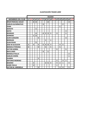 La tabla muestra los resultados de los miembros de un club en 34 carreras. José M. Alcaucín fue el que más puntos obtuvo con un total de 50, seguido de Manolo Periana con 33 puntos y Victor M. Arrebola también con 33 puntos.