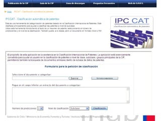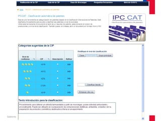 Este documento describe los pasos para clasificar un procedimiento de obtención de un extracto termoestable a partir de microalgas con actividad antioxidante y procicatrizante en la Clasificación Internacional de Patentes (CIP). Inicialmente se definen las palabras clave y se realiza una búsqueda en bases de datos de patentes que identifica varias CIP potenciales. Luego, se revisa el clasificador CIP para seleccionar cuáles se ajustan mejor a la tecnología descrita.