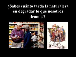 Este documento describe cuánto tiempo tarda la naturaleza en degradar diferentes tipos de desechos y destaca la importancia del reciclaje. Explica que los plásticos, vidrio y metales pueden tardar cientos de años en degradarse, mientras que los desechos orgánicos solo tardan 4 semanas. También resalta el trabajo de los recolectores de basura y clasificadores, y enfatiza la necesidad de que las personas clasifiquen correctamente sus desechos en bolsas de diferentes colores para facilitar el reciclaje