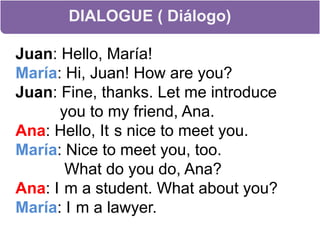 Este documento presenta un diálogo introductorio en inglés entre Juan, María y Ana. En el diálogo, Juan presenta a María y Ana, y ellas intercambian saludos y preguntan sobre sus ocupaciones. Luego, el documento explica frases comunes utilizadas en la introducción y el diálogo, como saludos, preguntas sobre el estado y la profesión. Finalmente, presenta vocabulario adicional relacionado con preguntas personales y una lista de profesiones.