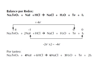 3) Se describen diferentes tipos de reacciones como de precipitación, ácido-base, y redox, así como los pasos para balancear reacciones redox.