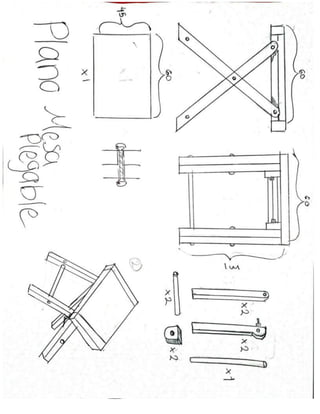 5. ya finalizadoesto, colocar el panel de cristal esmerilado de 65 cm por 45 cm, si no se cuenta con vidrio esmerilado, se puede colocar una lámina de plástico lijado, forzosamente tiene que ser lijado para que la iluminación de la lampara se difumine correctamente atreves de la lámina y se pueda visualizar sin problema, y para finalizar, la uniremos con 4 remaches en cada esquina respectivamente. Instructivo – mesa plegable 1. haremos diferentes marcaciones en todas las tablas de madera para que queden así respectivamente: - patas fijas: 4 tablones listones de 4.3 cm x 2.3 cm x 98 cm, (una marca de 2 cm en el largo y una marca en medio de la tabla, una marca de 25 cm para abajo del lado de la mitad, posteriormente, quedarán 4 tablas de madera, a cada una se le hará un recorte de una diagonal en la punta de cada una, después haremos un corte redondo en la otra punta de cada una, marcando el centro de estas. En dos tablas la diagonal irá de la punta derecha hacia la parte