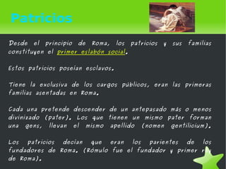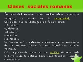 La sociedad romana se basaba en cinco clases sociales: 1) los patricios, que eran las primeras familias y tenían el monopolio de los cargos públicos; 2) los plebeyos, que constituían la mayor parte de la población pero no podían participar en lo político ni religioso; 3) los esclavos, que carecían de derechos y realizaban los trabajos más difíciles; 4) los clientes, que trabajaban para los patricios a cambio de protección; y 5) los libertos, esclavos a los que se
