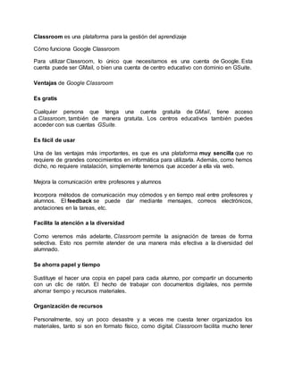 Google Classroom es una plataforma gratuita para la gestión del aprendizaje que mejora la comunicación entre profesores y alumnos, facilita la atención a la diversidad y ayuda a organizar los recursos didácticos. Se integra con otras aplicaciones de Google como Drive y Gmail y ofrece versiones móviles, todo sin publicidad ni cesión de datos personales.