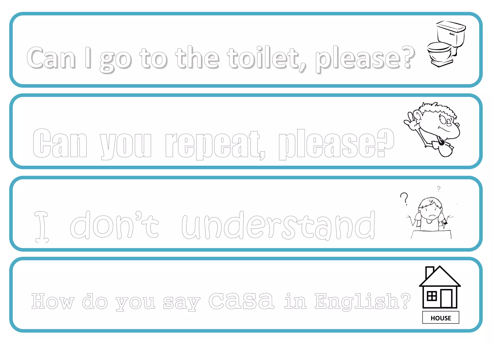 Carteles para imprimir, colorear y colgar en el aula para promover el uso de la lengua inglesa en clase. Plastificar para una mejor conserva. Año de creación: 2015.