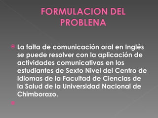 La falta decomunicación oral en Inglés se puede resolver con la aplicación de actividades comunicativas en los estudiantes de Sexto Nivel del Centro de Idiomas de la Facultad de Ciencias de la Salud de la Universidad Nacional de Chimborazo.
