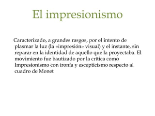 Claude Monet (1840-1926) fue un pintor francés y figura clave del movimiento impresionista. Se caracterizó por plasmar la luz y el instante sin reparar en detalles, utilizando pinceladas sueltas. Sus primeras obras fueron realistas pero a partir de 1860 comenzó a pintar en estilo impresionista. En las décadas de 1870 y 1880 refinó su técnica realizando viajes para estudiar los efectos de la luz. A partir de 1890 su pintura se volvió más compleja y melancólica