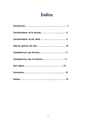Este documento presenta un informe de prácticas realizadas por un estudiante de pedagogía en la Escuela Normal Experimental de “El Fuerte” Extensión Mazatlán. Describe las características de la escuela, los estudiantes y el aula donde realizó sus observaciones. La escuela cuenta con 12 salones de clase, áreas comunes y servicios básicos. Los estudiantes son de 7-8 años, de nivel socioeconómico medio-alto y muestran buen comportamiento, aunque algunos presentan problemas de aprendizaje