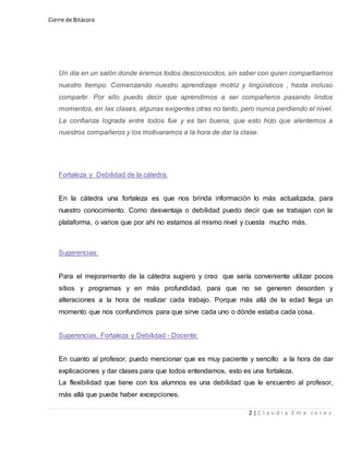 El documento presenta el cierre de una bitácora de Claudia Ema Jerez para la cátedra de TIC - TED. Incluye registros de observaciones de diferentes clases de entrenamiento deportivo, con descripciones de actividades y materiales utilizados. También contiene sugerencias para la cátedra y el docente, resaltando puntos fuertes como la actualización de contenidos y la paciencia del profesor.