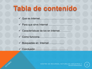 El documento describe qué es Internet, cómo funciona y sus usos. Explica que Internet es una red mundial de ordenadores interconectados que ofrece servicios como correo electrónico, páginas web y chat. Los ordenadores servidores proporcionan estos servicios de forma descentralizada a los usuarios que los solicitan. También habla sobre los motores de búsqueda y cómo se pueden usar para encontrar información en Internet de manera efectiva.