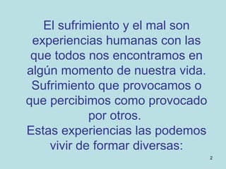 El documento habla sobre la experiencia de perdón de una mujer llamada Claudina. A pesar de sufrir injusticias que afectaron su salud, ella eligió perdonar a sus ofensores siguiendo el ejemplo de Jesús. A lo largo de su vida mantuvo esta actitud de perdón ante conflictos y sufrimientos. Su experiencia de Dios la mantuvo abierta al perdón y reconciliación, iluminando a otros con su ejemplo de bondad.