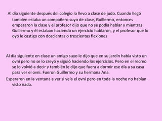 El documento narra la historia de Claudio y su relación con su padre y el judo desde la perspectiva de Claudio. Inicialmente, Claudio no quería ir a clases de judo aunque su padre insistió que algún día se lo agradecería. Más tarde, Claudio y su amigo se metieron en problemas durante la clase por hablar y tuvieron que hacer flexiones. Al final, Claudio se dio cuenta que el judo no era tan malo y aprendió la importancia de escuchar atentamente a los demás.