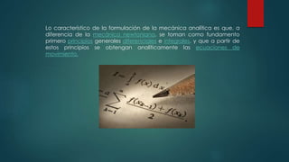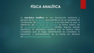 La mecánica analítica es una formulación abstracta y general de la mecánica que permite el uso de sistemas inerciales y no inerciales sin cambiar la forma básica de las ecuaciones de movimiento, a diferencia de las leyes de Newton. Se basa en principios generales diferenciales e integrales de los que se derivan analíticamente las ecuaciones de movimiento, en lugar de partir de las leyes de Newton como la mecánica newtoniana. La mecánica analítica tiene dos formulaciones principales: la formulación lagrangiana y la formulación ham