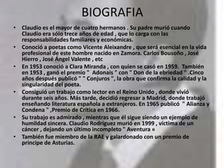 Claudio Rodríguez fue un poeta español del siglo XX. Perdió a su padre a una edad temprana y asumió las responsabilidades de su familia. Tuvo éxito temprano con su poesía y conoció a otros importantes poetas. Publicó varios libros de poesía aclamados que establecieron su reputación como uno de los poetas más singulares de España en el siglo XX.