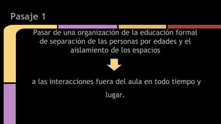 El documento describe las claves para el trabajo colaborativo en propuestas de posgrado a distancia. Propone pasar de una educación formal separada por edades y espacios a interacciones fuera del aula en cualquier momento y lugar, y aprovechar el potencial de las nuevas generaciones y las redes para crear conocimiento flexible de manera colaborativa. También sugiere pasar de universidades analógicas a formatos híbridos enriquecidos con tecnología y generar espacios de innovación como laboratorios de acceso abierto e integrar clústers