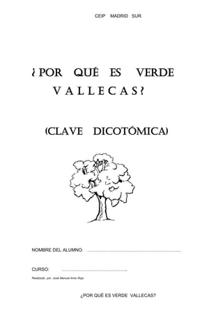 Este documento presenta un método dicotómico para clasificar las hojas de las plantas de Vallecas basado en la observación de sus características. Se explican criterios como la disposición de las hojas en las ramas, su aspecto, estructura, contorno, forma y tacto. El objetivo es enseñar a los estudiantes a identificar los árboles mediante el reconocimiento de sus hojas.