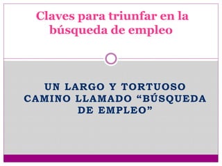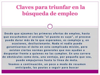 El documento ofrece consejos para tener éxito en la búsqueda de empleo. Recomienda mantener la calma y seriedad, buscar oportunidades de manera proactiva y exhaustiva, organizar la información de manera efectiva, y promocionarse a uno mismo a través de redes de contactos, ya que la mayoría de las personas encuentran trabajo por medio de familiares, amigos y conocidos.