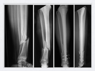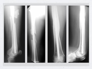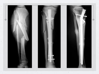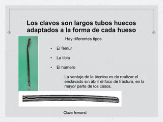 El documento describe las técnicas de tratamiento quirúrgico de fracturas mediante el uso de clavos centromedulares. Estos clavos permiten fijar fracturas sin necesidad de abrir el foco de fractura. Se detallan los procedimientos para colocar clavos en el fémur, la tibia y el húmero, así como las ventajas de esta técnica como la preservación del hematoma y callo óseo de alta calidad. El único desplazamiento que no se reduce es la rotación, la cual puede corregirse bloqueando el