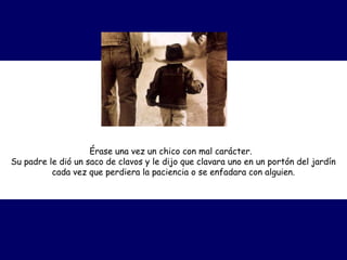 Un padre le enseñó a su hijo con mal carácter a controlar su ira clavando un clavo en la puerta cada vez que se enfadara. Con el tiempo, el hijo fue capaz de controlarse y quitó todos los clavos, aunque quedaron agujeros que muestran que las palabras hirientes dejan cicatrices como las físicas. La amistad verdadera es valiosa y los amigos están ahí para escucharnos y apoyarnos.