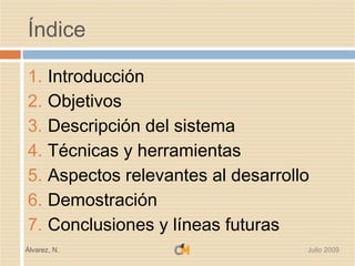 El documento describe un proyecto de fin de carrera para adaptar contenidos de Moodle a dispositivos móviles. Se presentan la introducción, objetivos, descripción del sistema, técnicas utilizadas, aspectos relevantes del desarrollo, demostración y conclusiones. El proyecto tuvo como objetivo permitir el acceso a contenidos de Moodle desde móviles de forma sencilla e intuitiva.