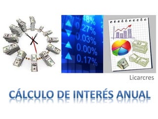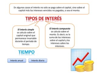 Este documento explica los conceptos básicos de interés simple, interés compuesto y tasas de interés. Define capital e interés, y describe cómo calcular el interés anual aplicando porcentajes al capital original. Además, presenta tres casos prácticos para calcular el interés, la tasa de interés o el capital inicial utilizando fórmulas o la regla de tres.